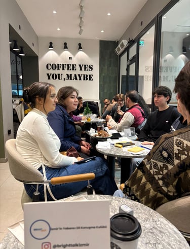 Yeni insanlarla tanışmak, İngilizce pratiğini rutine dönüştürmek ve keyifli bir topluluğun parçası olmak istiyorsan, BrightTalk İzmir seni bekliyor.